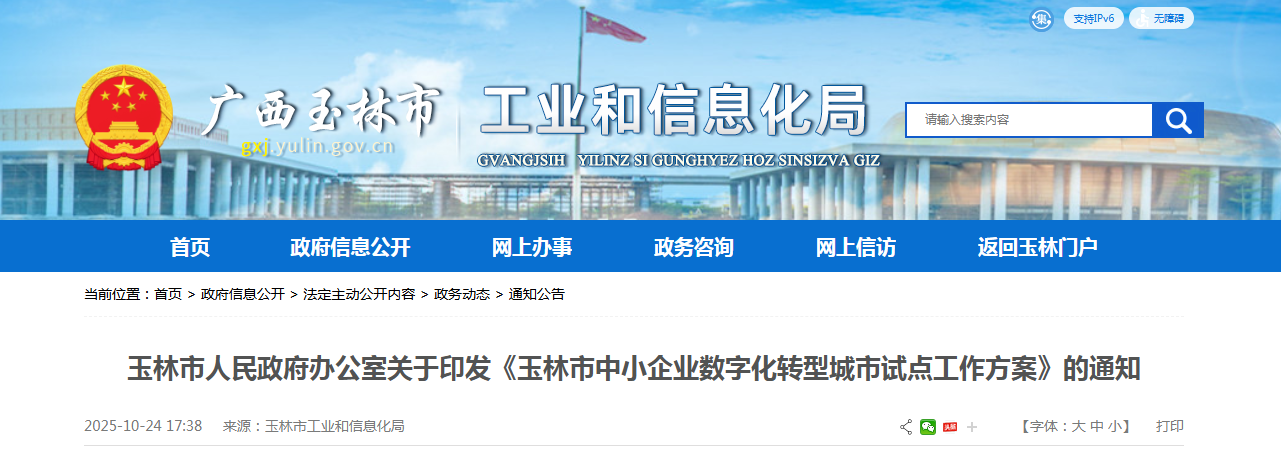 玉林市人民政府办公室关于印发《玉林市中小企业数字化转型城市试点工作方案》的通知