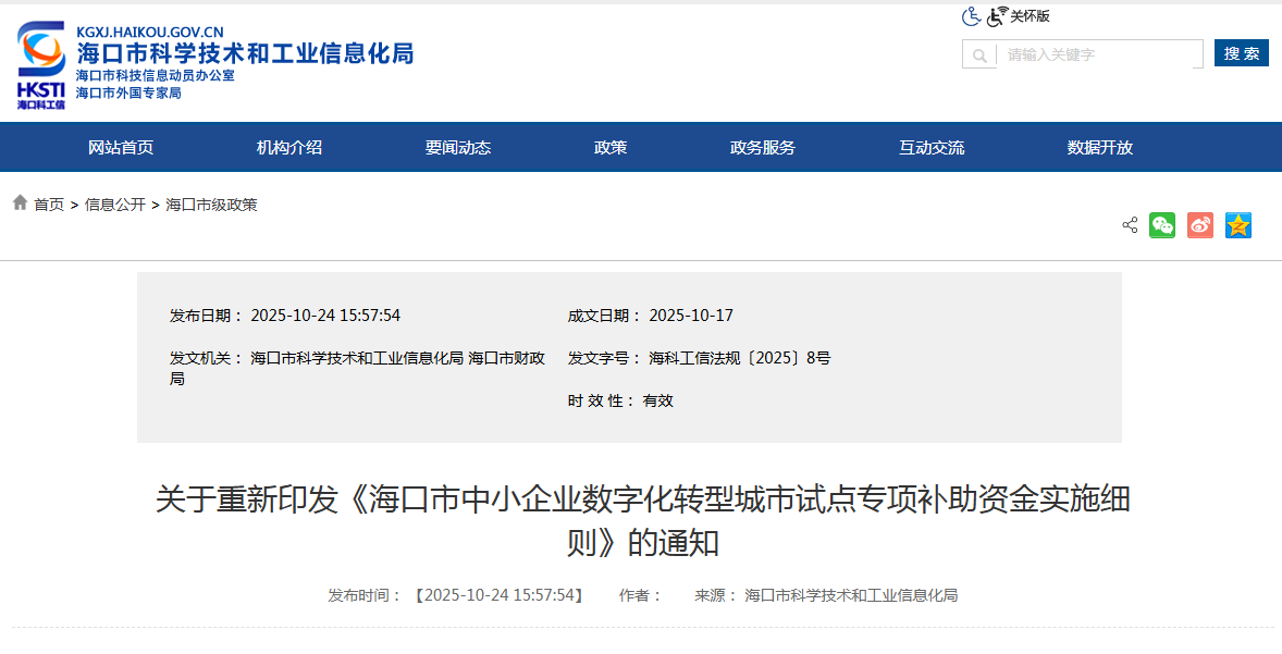 1.海口市中小企业数字化转型城市试点专项补助资金实施细则(2025年版)
