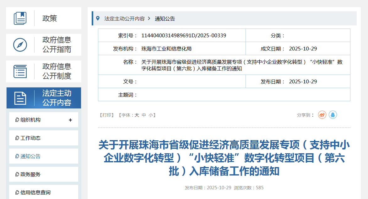 关于开展珠海市省级促进经济高质量发展专项(支持中小企业数字化转型)“小快轻准”数字化转型项目(第六批)入库储备工作的通知