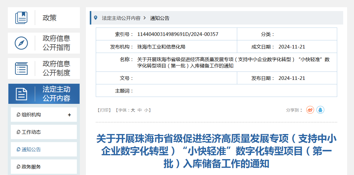 关于开展珠海市省级促进经济高质量发展专项(支持中小企业数字化转型)“小快轻准”数字化转型项目(第一批)入库储备工作的通知