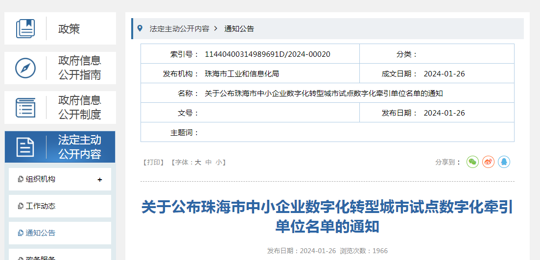 关于公布珠海市中小企业数字化转型城市试点数字化牵引单位名单的通知