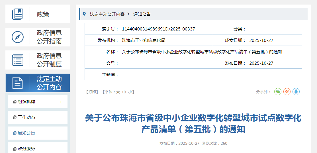 关于公布珠海市省级中小企业数字化转型城市试点数字化产品清单(第五批)的通知