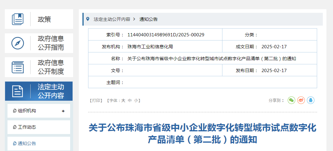 关于公布珠海市省级中小企业数字化转型城市试点数字化产品清单(第二批)的通知