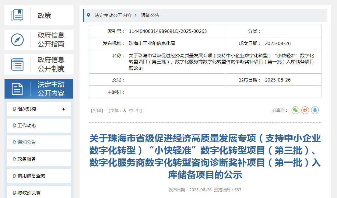 关于珠海市省级促进经济高质量发展专项(支持中小企业数字化转型)“小快轻准”数字化转型项目(第三批)、数字化服务商数字化转型咨询诊断奖补项目(第一批)入库储备项目的公示
