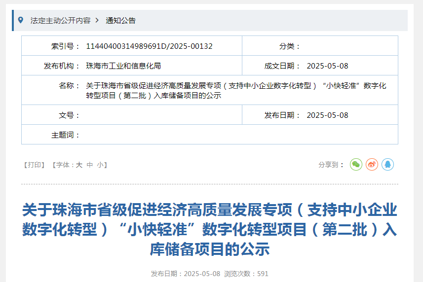 关于珠海市省级促进经济高质量发展专项(支持中小企业数字化转型)“小快轻准”数字化转型项目(第二批)入库储备项目的公示