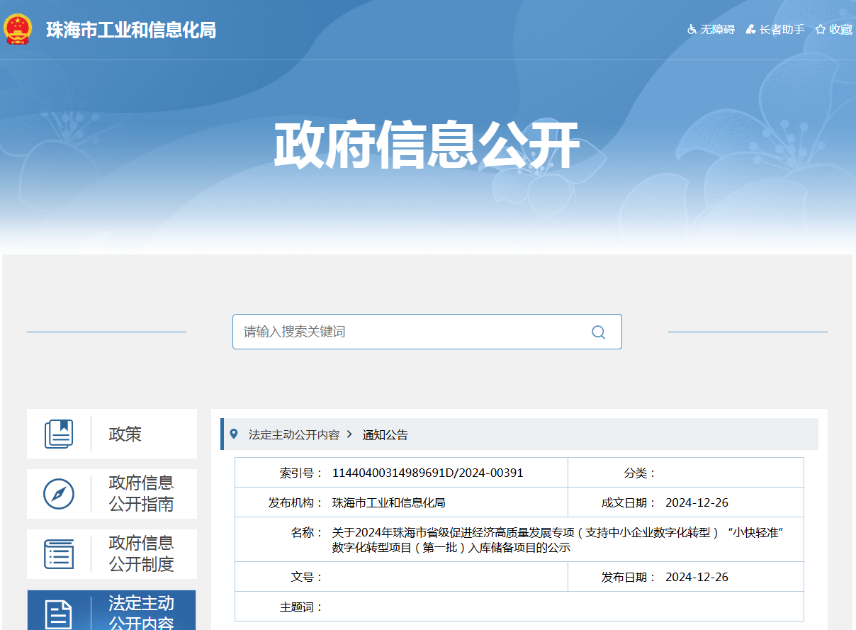 关于2024年珠海市省级促进经济高质量发展专项(支持中小企业数字化转型)“小快轻准”数字化转型项目(第一批)入库储备项目的公示