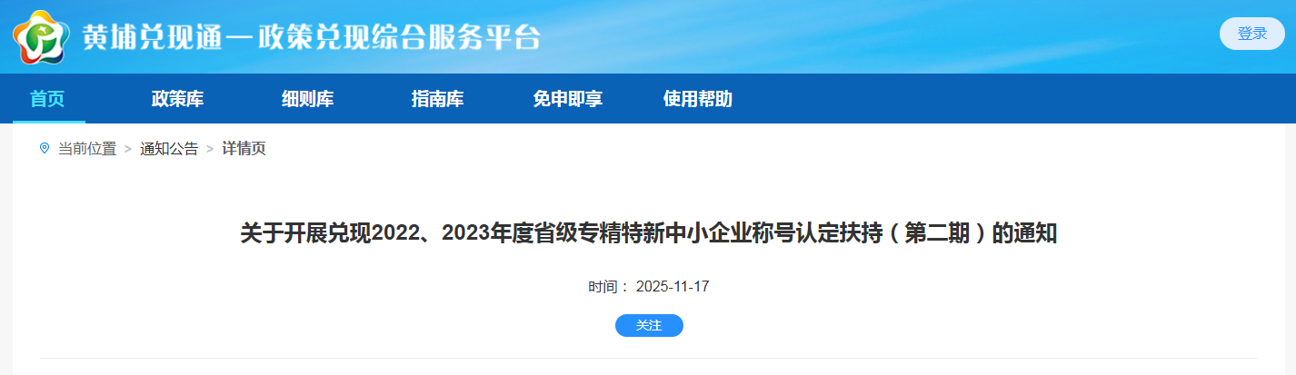 根据《广州市黄埔区 广州开发区进一步支持专精特新企业高质量发展办法》(穗埔工信规字〔2021〕5号,以下简称《办法》)和《广州市黄埔区 广州开发区进一步支持专精特新企业高质量发展办法实施细则》(穗埔工信规字〔2021〕7号)文件精神,按照政策兑现相关规定,现组织开展2022、2023年度省级专精特新中小企业认定扶持(第二批)政策兑现工作。有关要求及时间节点安排如下: