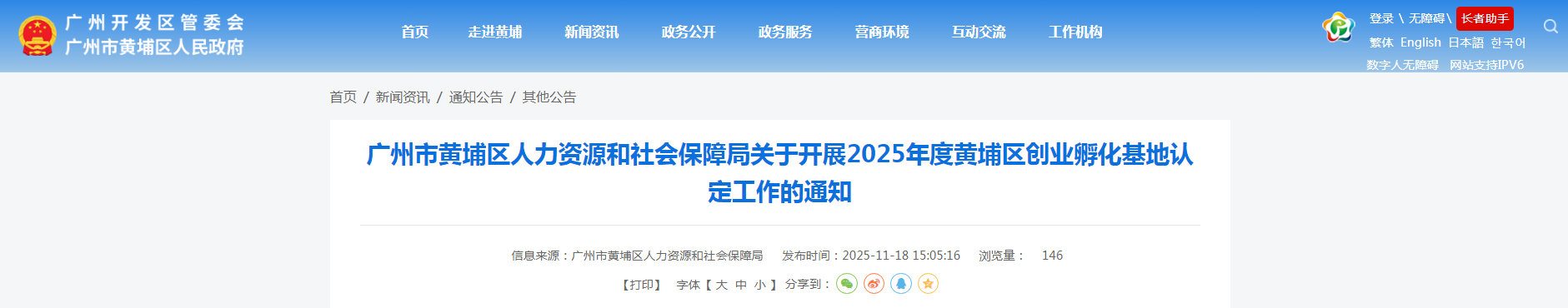 广州市黄埔区人力资源和社会保障局关于开展2025年度黄埔区创业孵化基地认定工作的通知