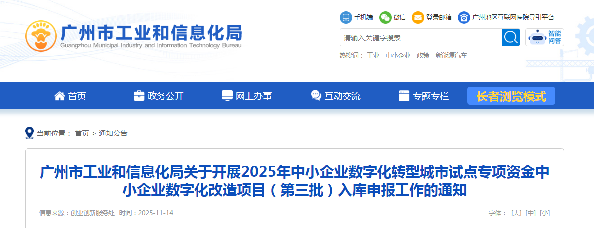 广州市工业和信息化局关于开展2025年中小企业数字化转型城市试点专项资金中小企业数字化改造项目(第三批)入库申报工作的通知