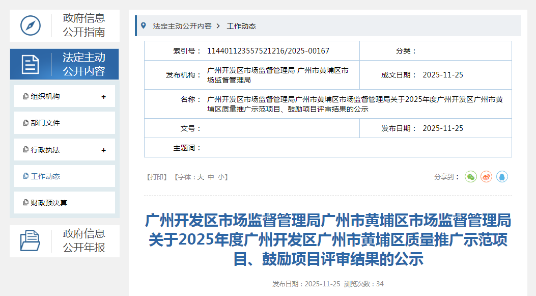 广州开发区市场监督管理局广州市黄埔区市场监督管理局关于2025年度广州开发区广州市黄埔区质量推广示范项目、鼓励项目评审结果的公示