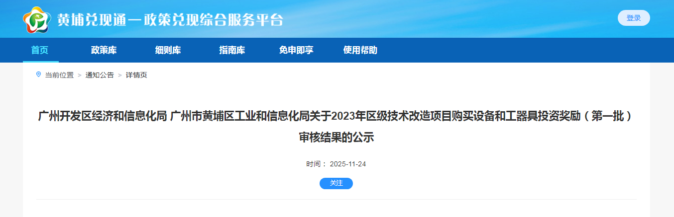 广州开发区经济和信息化局 广州市黄埔区工业和信息化局关于2023年区级技术改造项目购买设备和工器具投资奖励(第一批)审核结果的公示