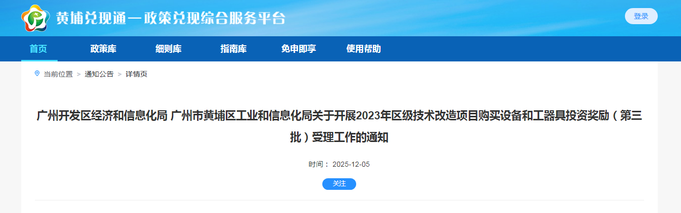 广州开发区经济和信息化局 广州市黄埔区工业和信息化局关于开展2023年区级技术改造项目购买设备和工器具投资奖励(第三批)受理工作的通知