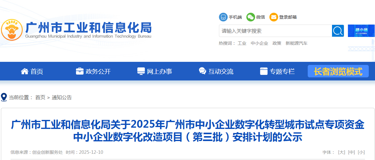 广州市工业和信息化局关于2025年广州市中小企业数字化转型城市试点专项资金中小企业数字化改造项目(第三批)安排计划的公示