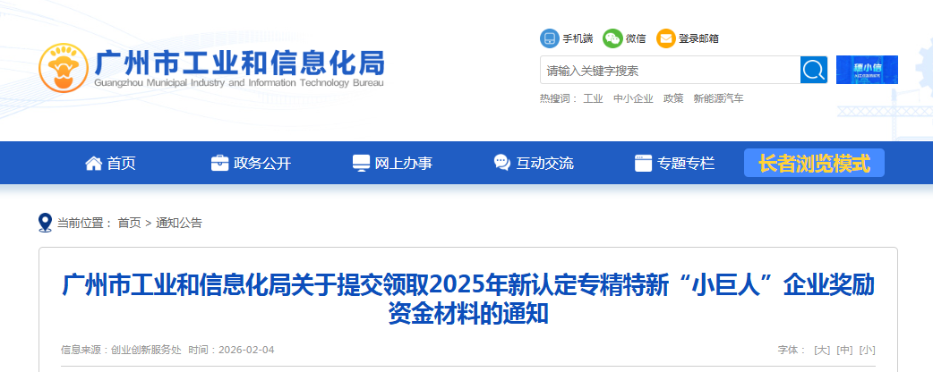 三、申报时间:企业在“广州市工业和信息化发展专项资金管理系统”上提交申领材料的时间为:2026年2月4日(周三)9:00至2026年2月9日(周一)18:00前,逾期不予受理。不具备资金拨付条件的,暂缓拨付奖励资金,我局将另行通知企业申领。