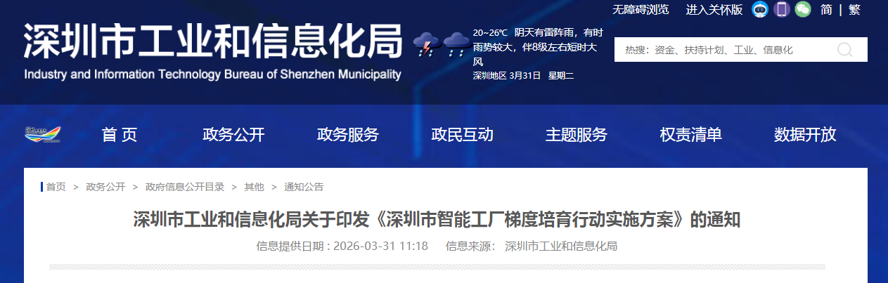 湾企服政策指引:为深入贯彻工业和信息化部等部委关于智能工厂梯度培育的工作部署,扎实推进我市智能工厂梯度建设,推动我市制造业智能化绿色化融合化发展,现将《深圳市智能工厂梯度培育行动实施方案》印发给你们,请结合实际认真组织实施。