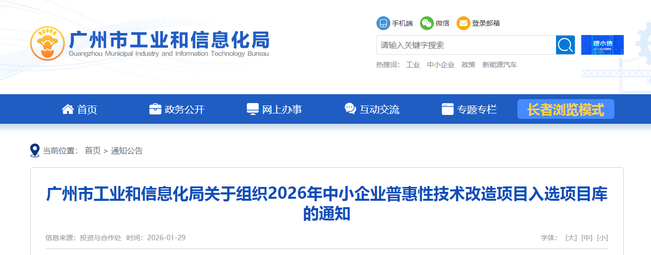 广州市工业和信息化局关于组织2026年中小企业普惠性技术改造项目入选项目库的通知