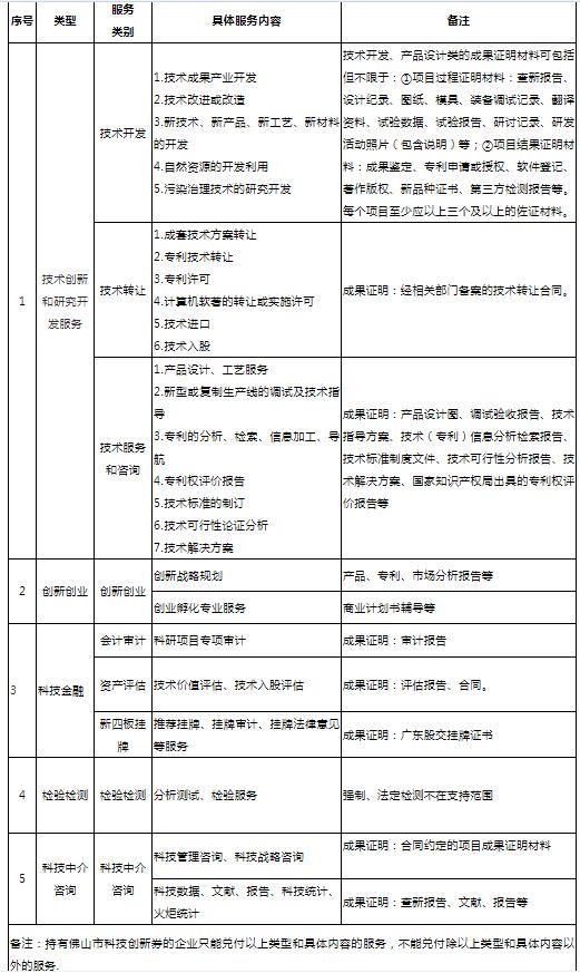 佛山市科技创新券服务内容一览表