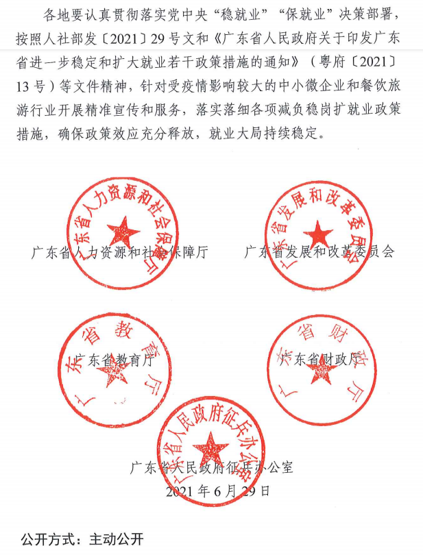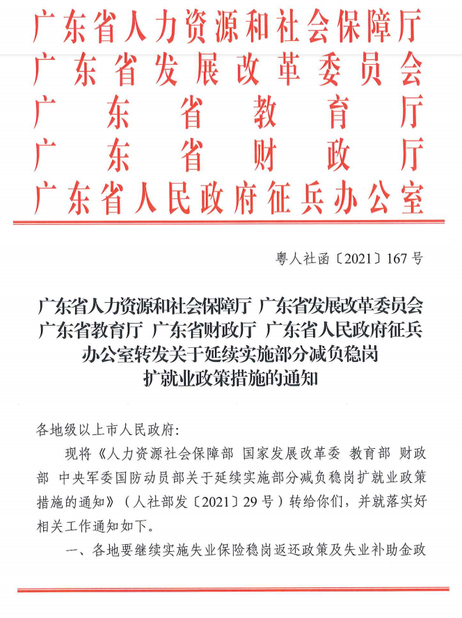 现将《广东省人力资源和社会保障厅 广东省发展改革委员会 广东省教育厅 广东省财政厅 广东省人民政府征兵办公室转发关于延续实施部分减负稳岗扩就业政策措施的通知》(粤人社函〔2021〕167号)转发给你们,并就落实好相关工作通知如下: