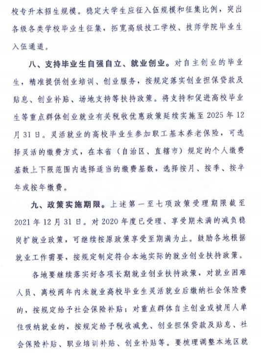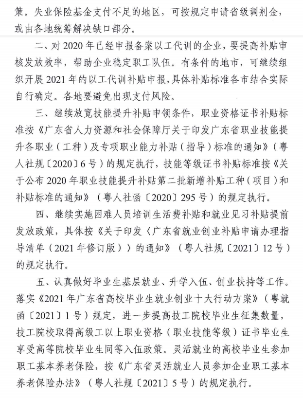 五、认真做好毕业生基本就业、升学入伍、创业扶持等工作。落实《2021年广东省高校毕业生就业创业十大行动方案》(粤就函〔2021〕1号)、《2021年广州市高校毕业生就业创业专项活动方案》(穗就函〔2021〕1号)规定,进一步提高技工院校毕业生征集数量,技工院校取得高级工以上职业资格(职业技能等级)证书毕业生享受高等院校毕业生同等入伍政策。灵活就业的高校毕业生参加职工基本养老保险,按《广东省灵活就业人员参加企业职工基本养老保险办法》(粤人社规〔2021〕5号)的规定执行。