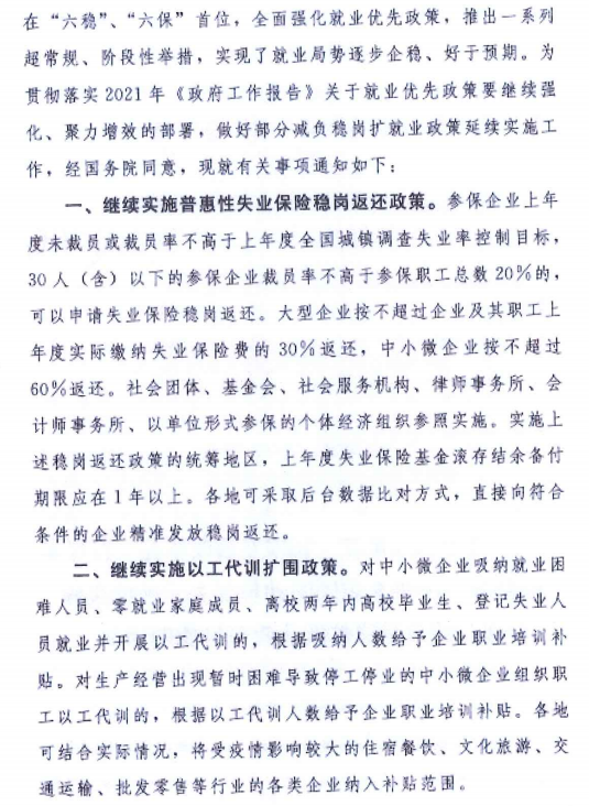 一、继续实施普惠性失业保险稳岗返还政策及失业保险保障扩围政策,具体按粤人社函〔2021〕167号文件的规定办理。