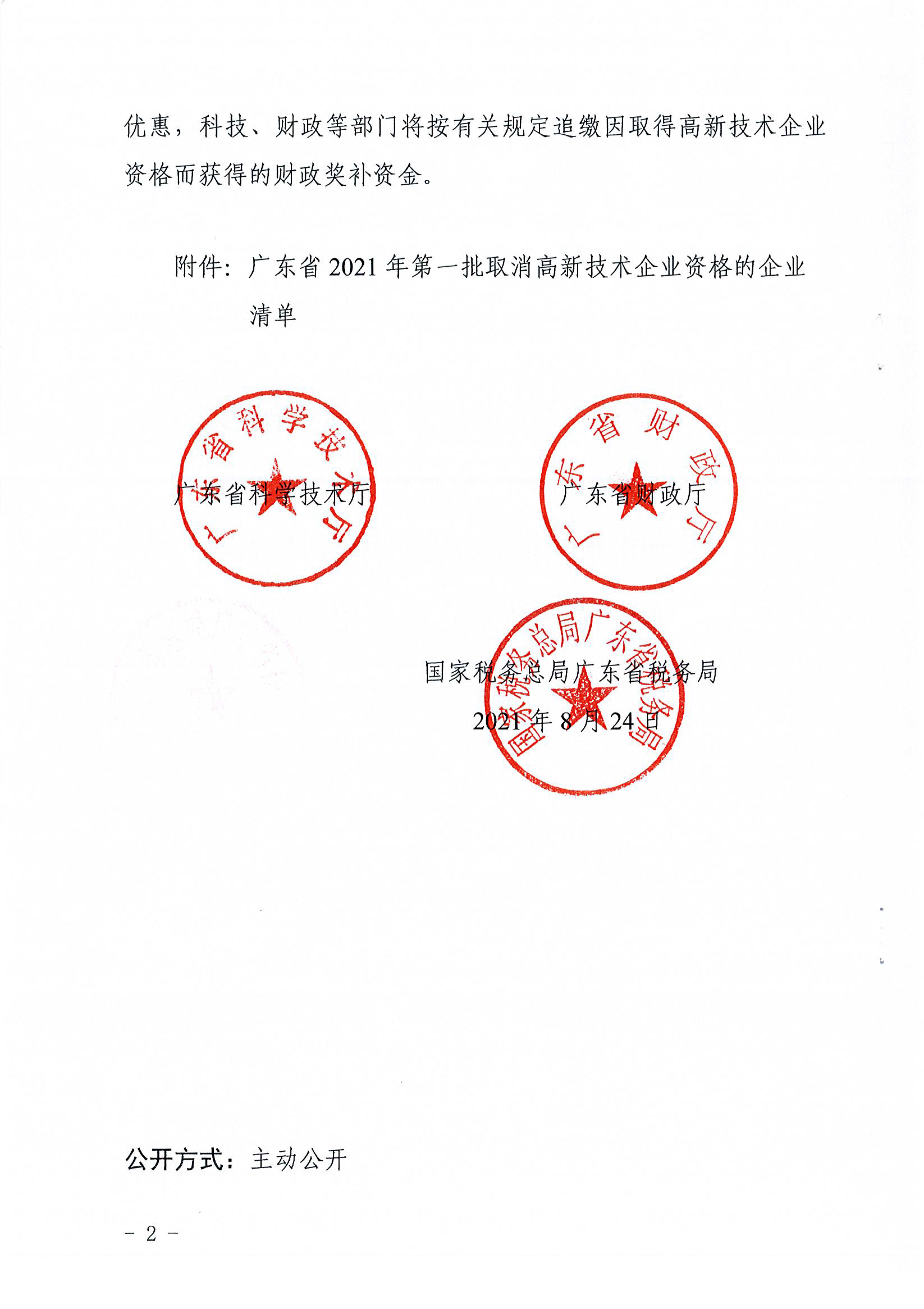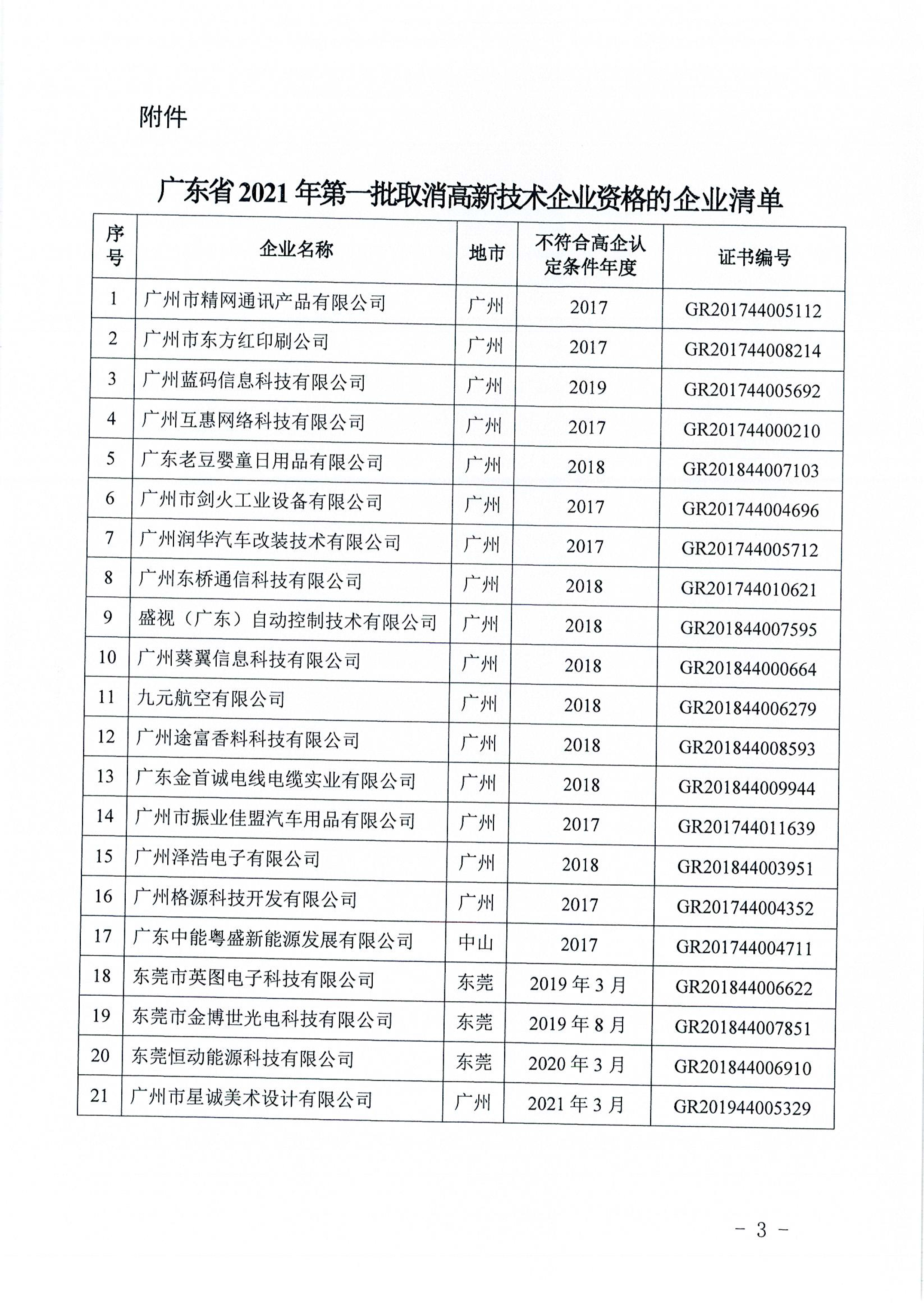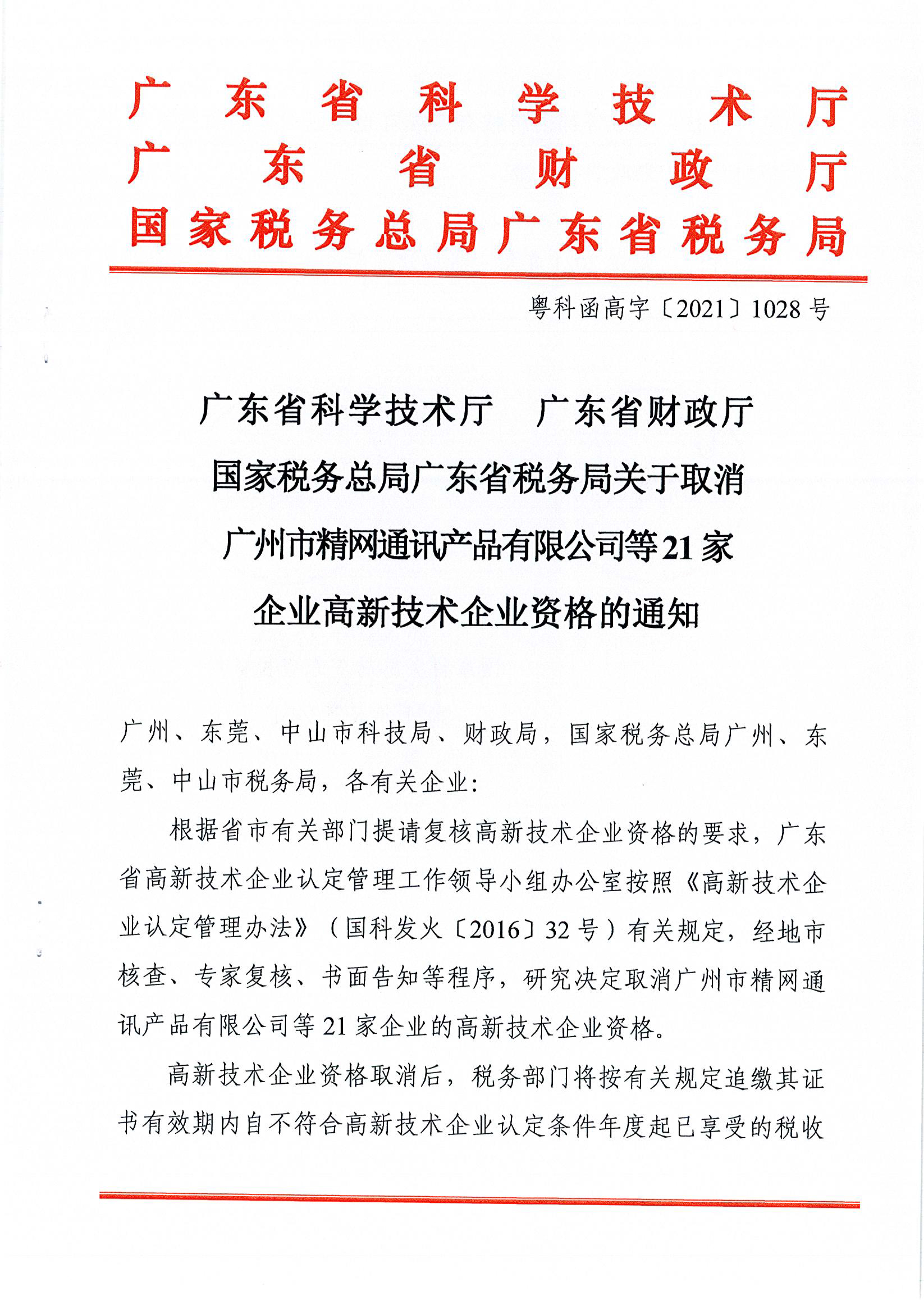 关于取消广州市精网通讯产品有限公司等21家企业高新技术企业资格的通知