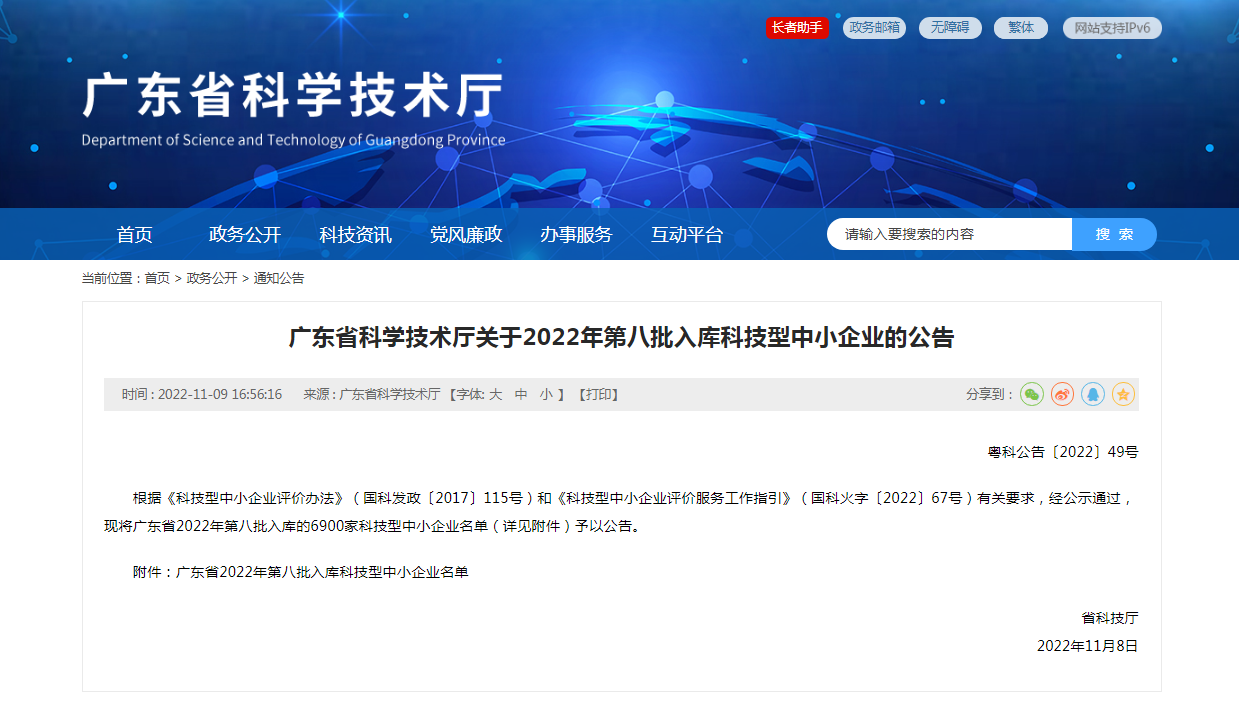 广东省科学技术厅关于2022年第八批入库科技型中小企业的公告