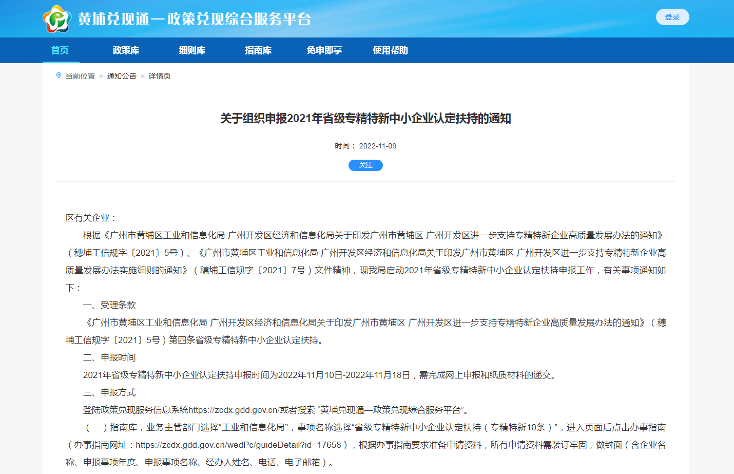 《广州市黄埔区工业和信息化局 广州开发区经济和信息化局关于印发广州市黄埔区 广州开发区进一步支持专精特新企业高质量发展办法的通知》(穗埔工信规字〔2021〕5号)第四条省级专精特新中小企业认定扶持。
