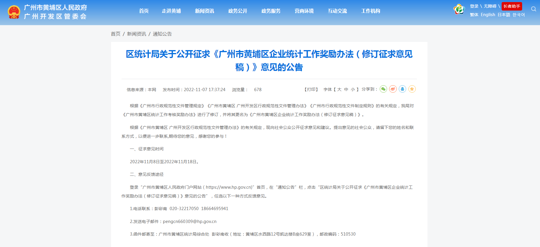 登录“广州市黄埔区人民政府门户网站(https://www.hp.gov.cn)”首页,在“通知公告”栏,点击“区统计局关于公开征求《广州市黄埔区企业统计工作奖励办法(修订征求意见稿)》意见的公告”,任选以下一种方式反馈意见。