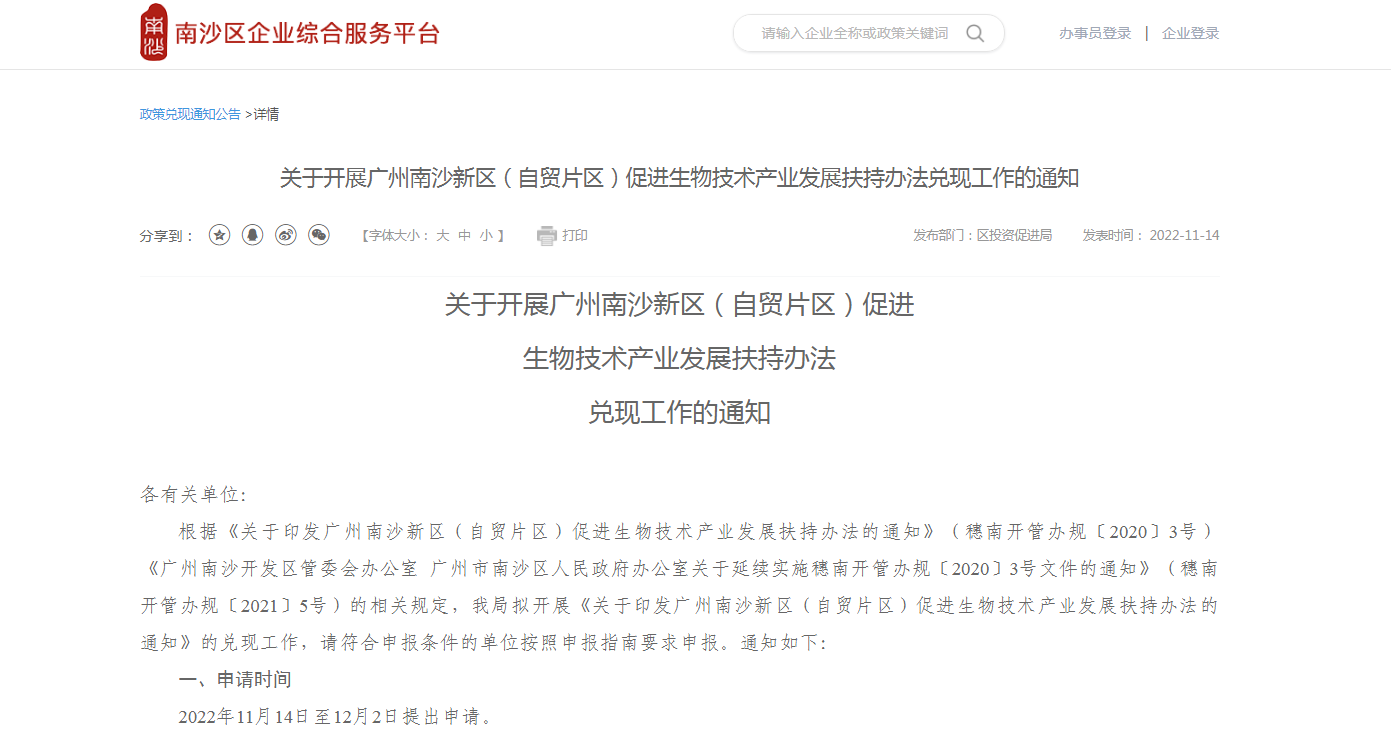 湾企服政策指引:广州南沙新区(自贸片区)促进生物技术产业发展扶持办法兑现工作的通知。