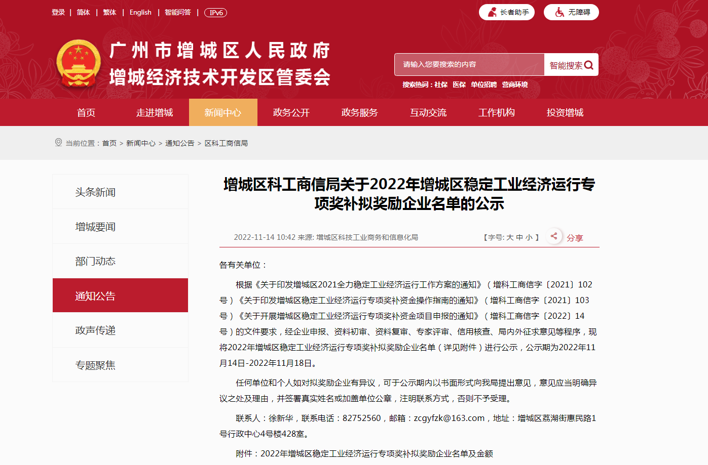 根据《关于印发增城区2021全力稳定工业经济运行工作方案的通知》(增科工商信字〔2021〕102号)《关于印发增城区稳定工业经济运行专项奖补资金操作指南的通知》(增科工商信字〔2021〕103号)《关于开展增城区稳定工业经济运行专项奖补资金项目申报的通知》(增科工商信字〔2022〕14号)的文件要求,经企业申报、资料初审、资料复审、专家评审、信用核查、局内外征求意见等程序,现将2022年增城区稳定工业经济运行专项奖补拟奖励企业名单(详见附件)进行公示,公示期为2022年11月14日-2022年11月18日。
