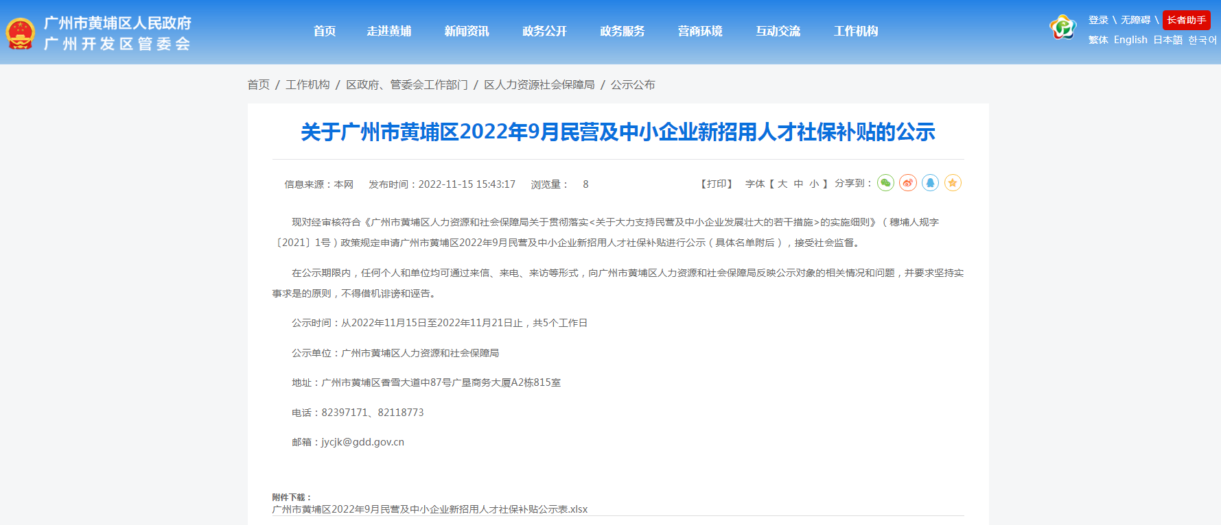 关于广州市黄埔区2022年9月民营及中小企业新招用人才社保补贴的公示
