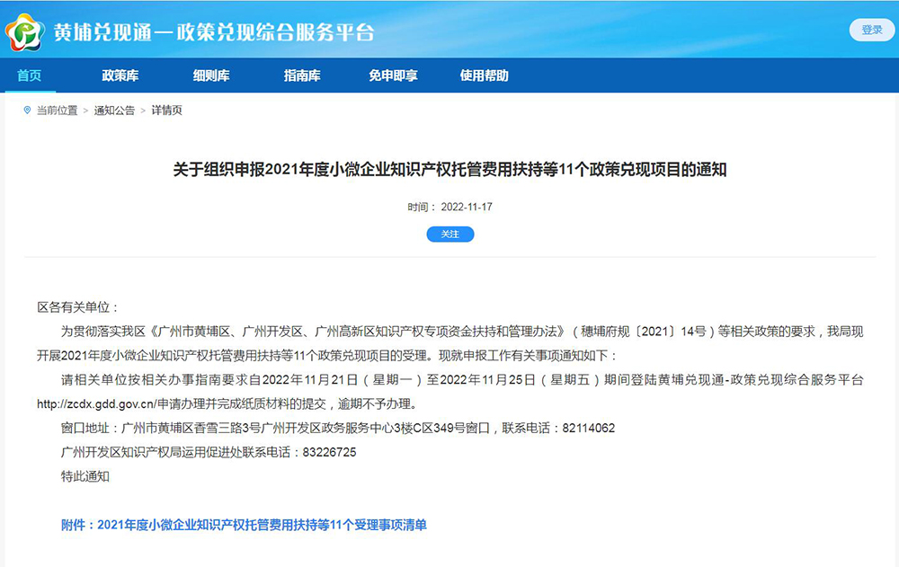 为贯彻落实我区《广州市黄埔区、广州开发区、广州高新区知识产权专项资金扶持和管理办法》(穗埔府规〔2021〕14号)等相关政策的要求,我局现开展2021年度小微企业知识产权托管费用扶持等11个政策兑现项目的受理。现就申报工作有关事项通知如下: