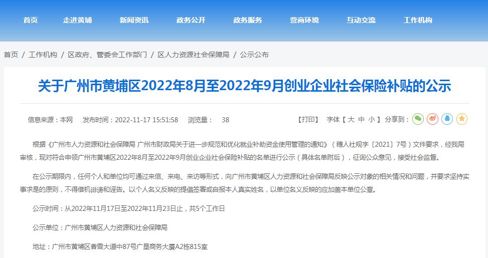 关于广州市黄埔区2022年8月至2022年9月创业企业社会保险补贴的公示