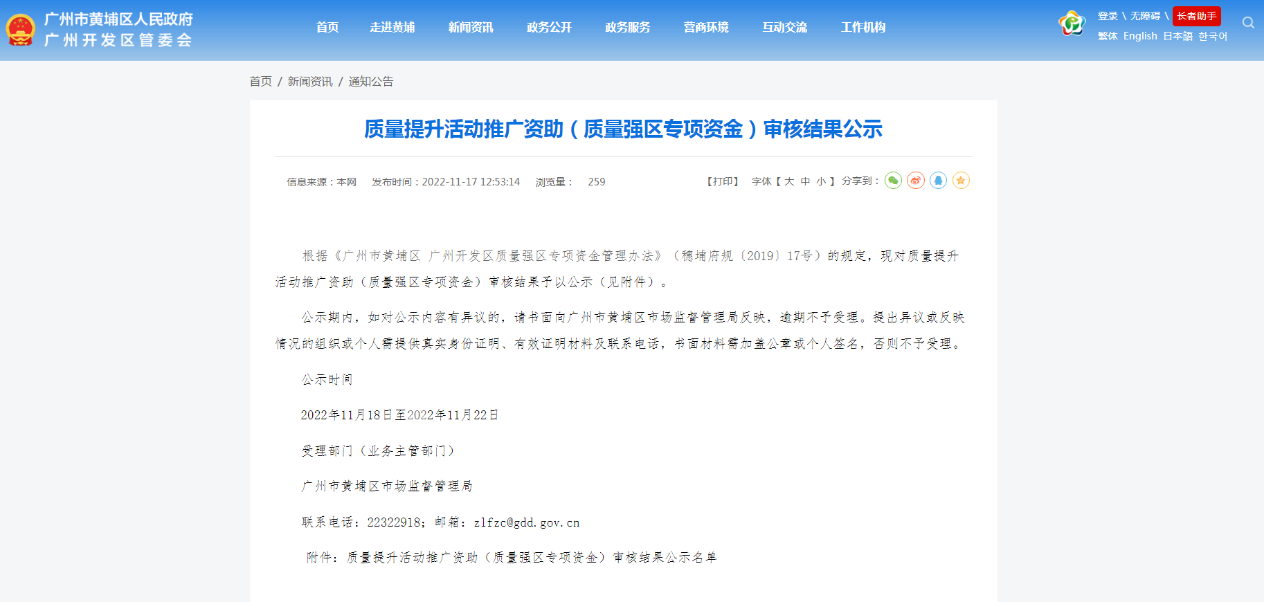 湾企服工作指引:根据《广州市黄埔区 广州开发区质量强区专项资金管理办法》(穗埔府规〔2019〕17号)的规定,现对质量提升活动推广资助(质量强区专项资金)审核结果予以公示。