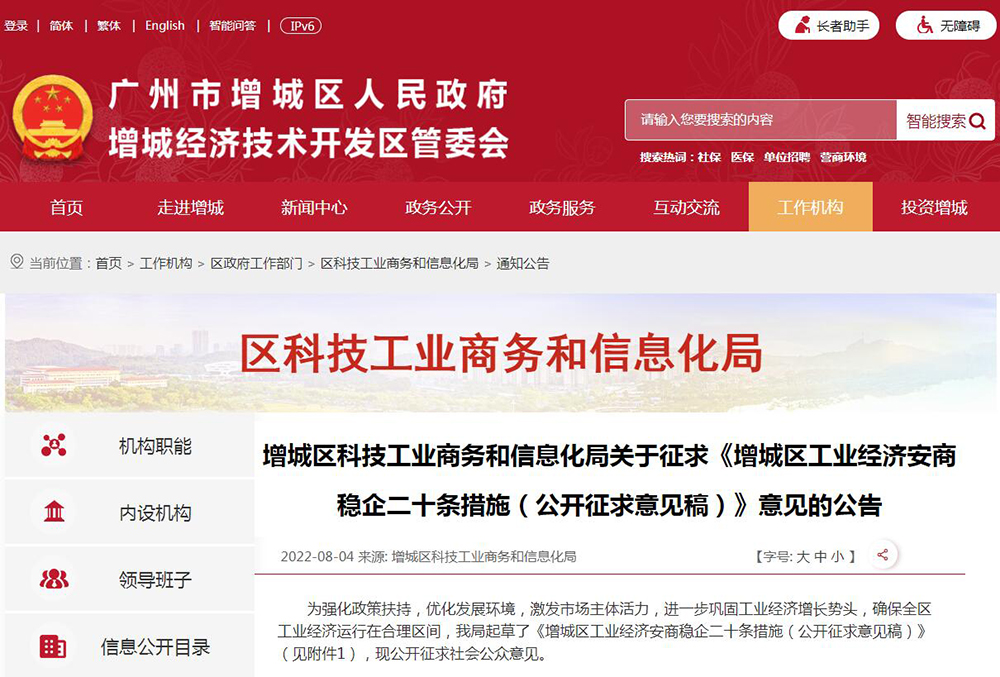 增城区科技工业商务和信息化局关于征求《增城区工业经济安商稳企二十条措施(公开征求意见稿)》意见的公告
