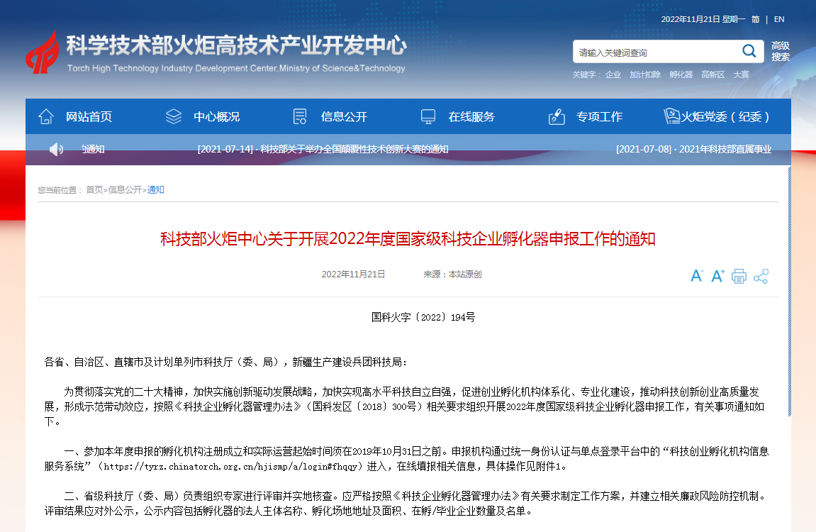 科技部火炬中心关于开展2022年度国家级科技企业孵化器申报工作的通知