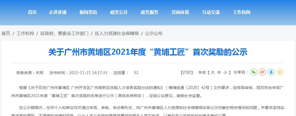 关于广州市黄埔区2021年度“黄埔工匠”首次奖励的公示