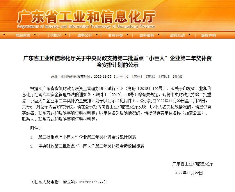 广东省工业和信息化厅关于中央财政支持第二批重点“小巨人”企业第二年奖补资金安排计划的公示