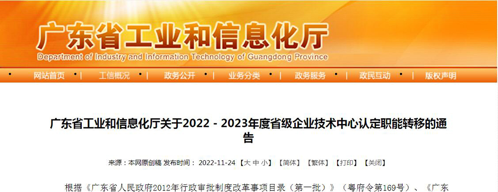 广东省工业和信息化厅关于2022-2023年度省级企业技术中心认定职能转移的通告