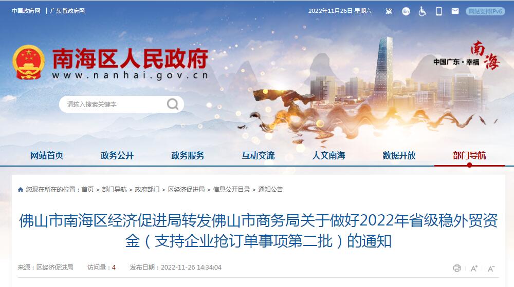 佛山市南海区经济促进局转发佛山市商务局关于做好2022年省级稳外贸资金(支持企业抢订单事项第二批)的通知