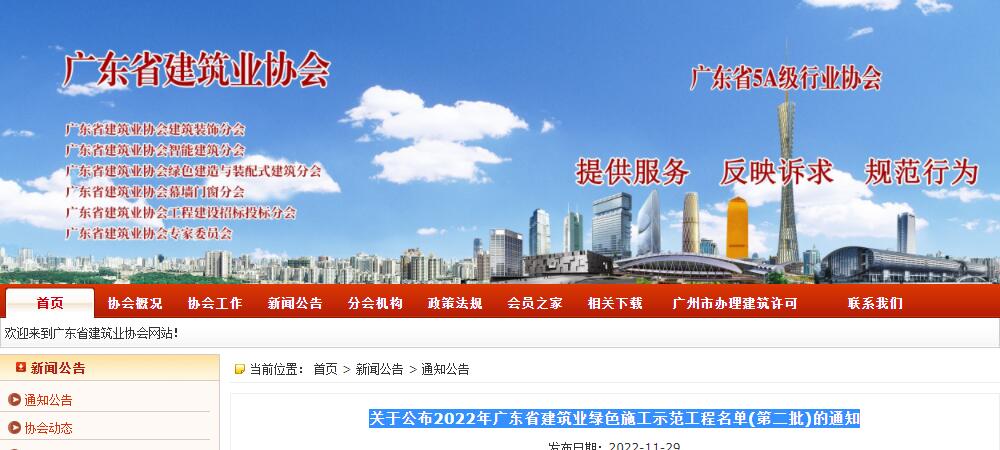 关于公布2022年广东省建筑业绿色施工示范工程名单(第二批)的通知