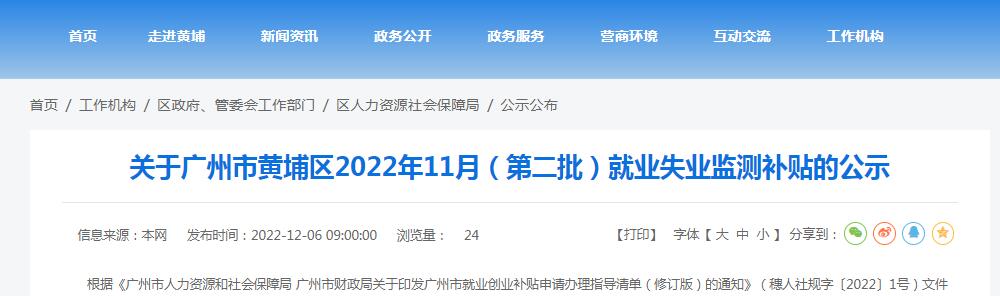 关于广州市黄埔区2022年11月(第二批)就业失业监测补贴的公示