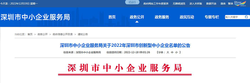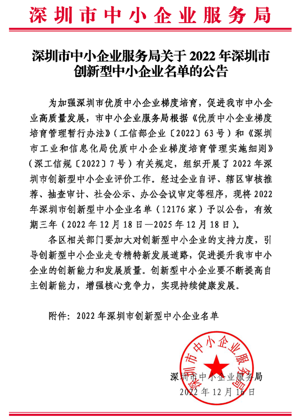 深圳市中小企业服务局关于2022年深圳市创新型中小企业名单的公告