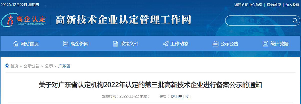 关于对广东省认定机构2022年认定的第三批高新技术企业备案公示的通知