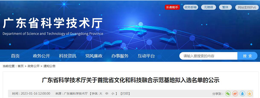 湾企服工作指引:广东省科学技术厅关于首批省文化和科技融合示范基地拟入选名单的公示。