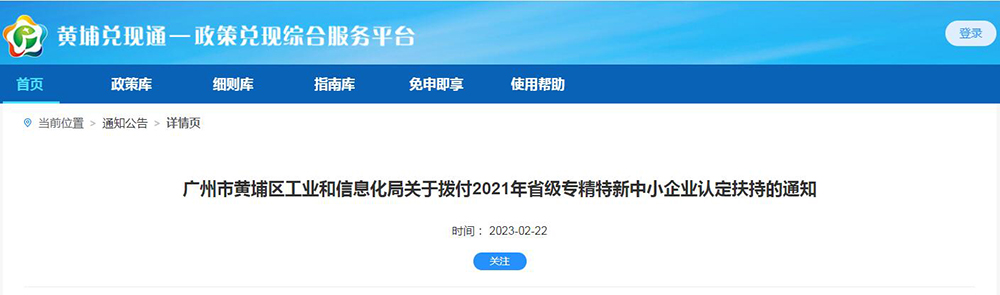 根据《广州市黄埔区工业和信息化局 广州开发区经济和信息化局关于印发广州市黄埔区 广州开发区进一步支持专精特新企业高质量发展办法的通知》(穗埔工信规字〔2021〕5号)、《广州市黄埔区工业和信息化局 广州开发区经济和信息化局关于印发广州市黄埔区 广州开发区进一步支持专精特新企业高质量发展办法实施细则的通知》(穗埔工信规字〔2021〕7号)文件精神,现同意拨付2021年省级专精特新中小企业认定扶持资金人民币伍拾万元整(¥500,000.00元),一次性拨付,具体明细详见附件。请根据本通知于2月22日-2月24日登录广州开发区政策兑现服务信息系统(http://zcdx.gdd.gov.cn)完成网上请款申请,办理资金拨付手续: