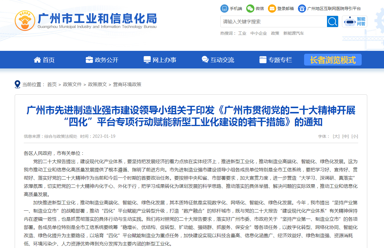 广州市贯彻党的二十大精神 开展“四化”平台专项行动赋能新型工业化建设的若干措施