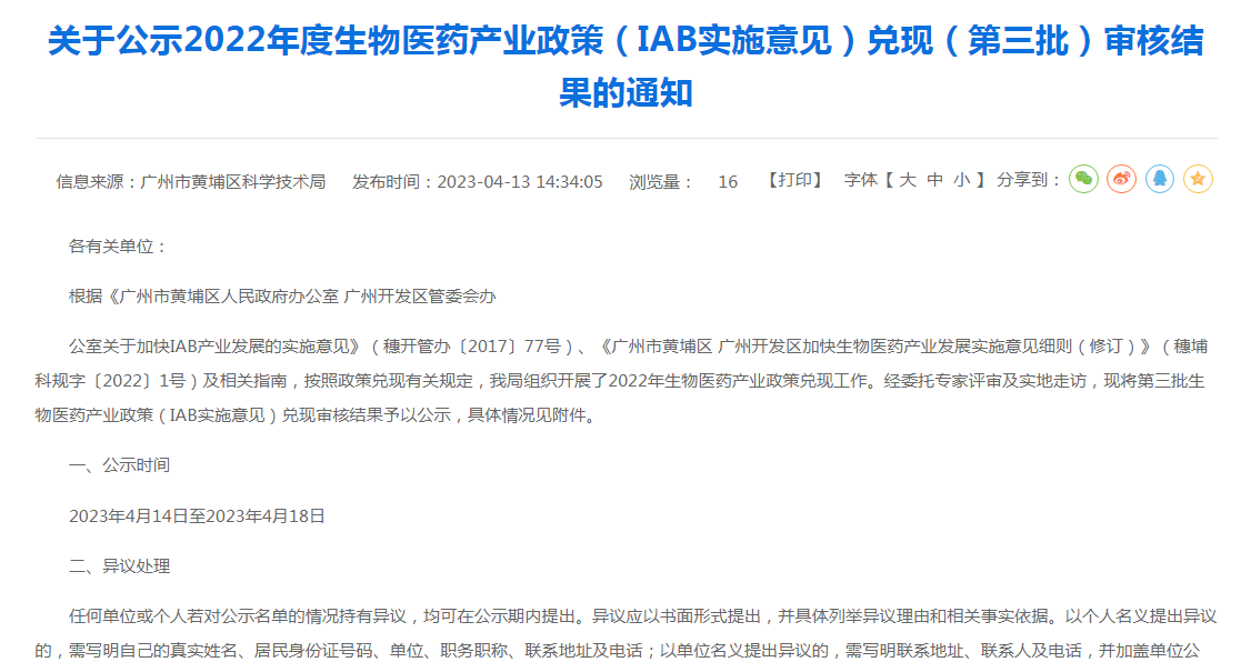 公室关于加快IAB产业发展的实施意见》(穗开管办〔2017〕77号)、《广州市黄埔区 广州开发区加快生物医药产业发展实施意见细则(修订)》(穗埔科规字〔2022〕1号)及相关指南,按照政策兑现有关规定,我局组织开展了2022年生物医药产业政策兑现工作。经委托专家评审及实地走访,现将第三批生物医药产业政策(IAB实施意见)兑现审核结果予以公示,具体情况见附件。
