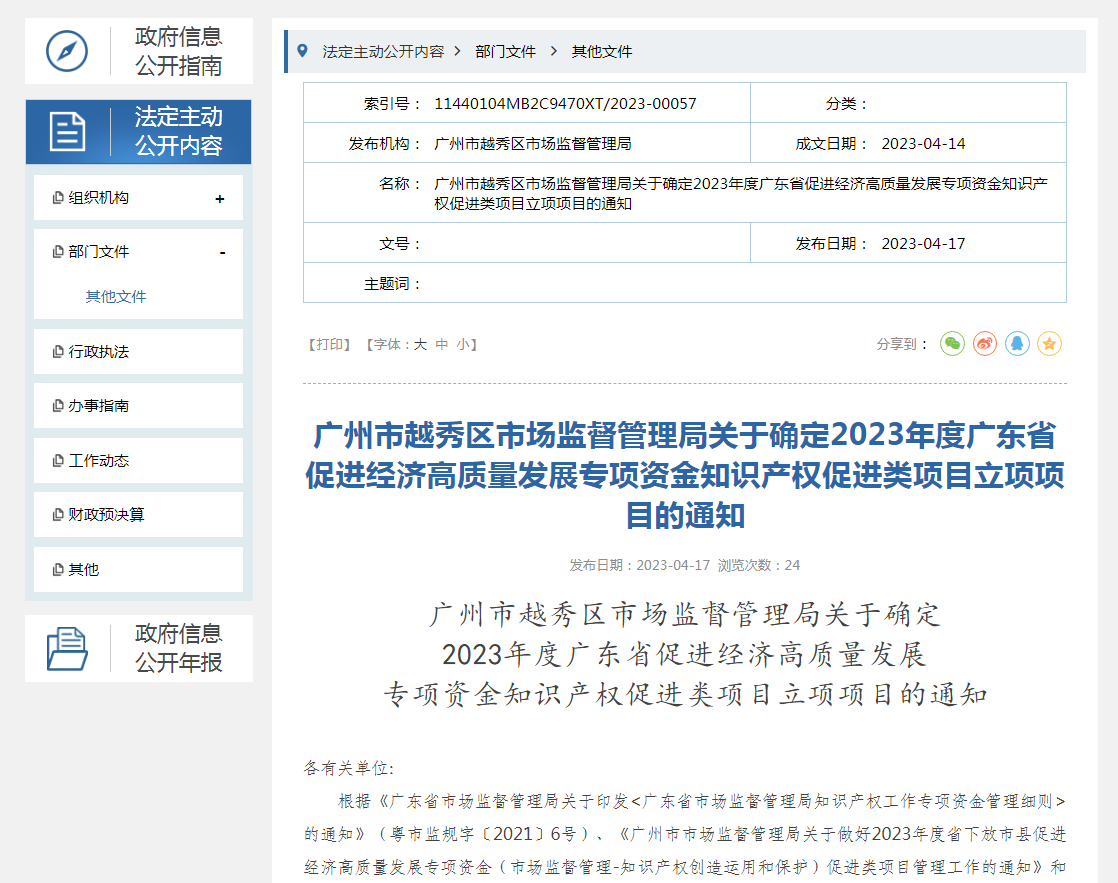 广州市越秀区市场监督管理局关于确定2023年度广东省促进经济高质量发展专项资金知识产权促进类项目立项项目的通知
