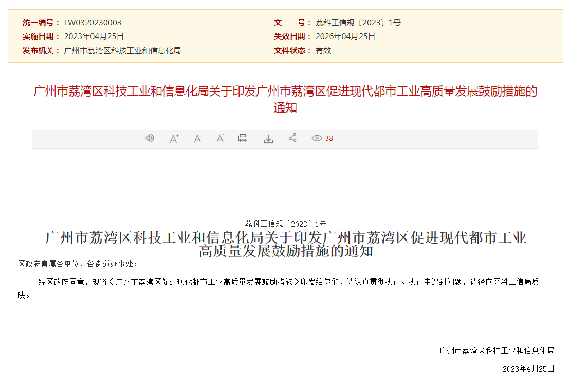 广州市荔湾区科技工业和信息化局关于印发广州市荔湾区促进现代都市工业高质量发展鼓励措施的通知